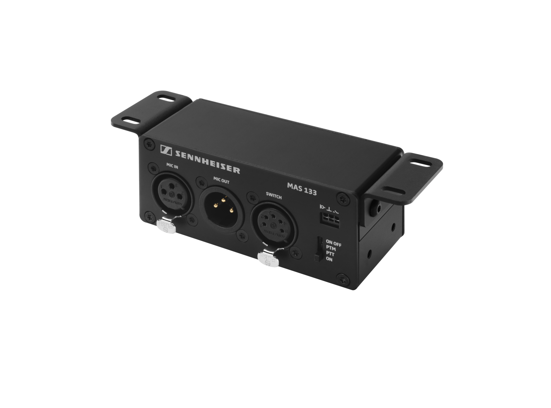 MAS 133 — это универсальная встраиваемая распределительная коробка XLR для интегрированных микрофонных решений. Закрепленный между микрофоном и микшерным пультом, он питает кнопку микрофона MAS 1. Способен управлять любым микрофоном, подключенным к XLR, с помощью переключаемых режимов активации микрофона (PTT, PTM, включение/выключение, постоянное включение). Кроме того, MAS 133 оснащен логикой TTL, позволяющей пользователю запускать, например, системы управления камерой или мультимедиа для различных целей.