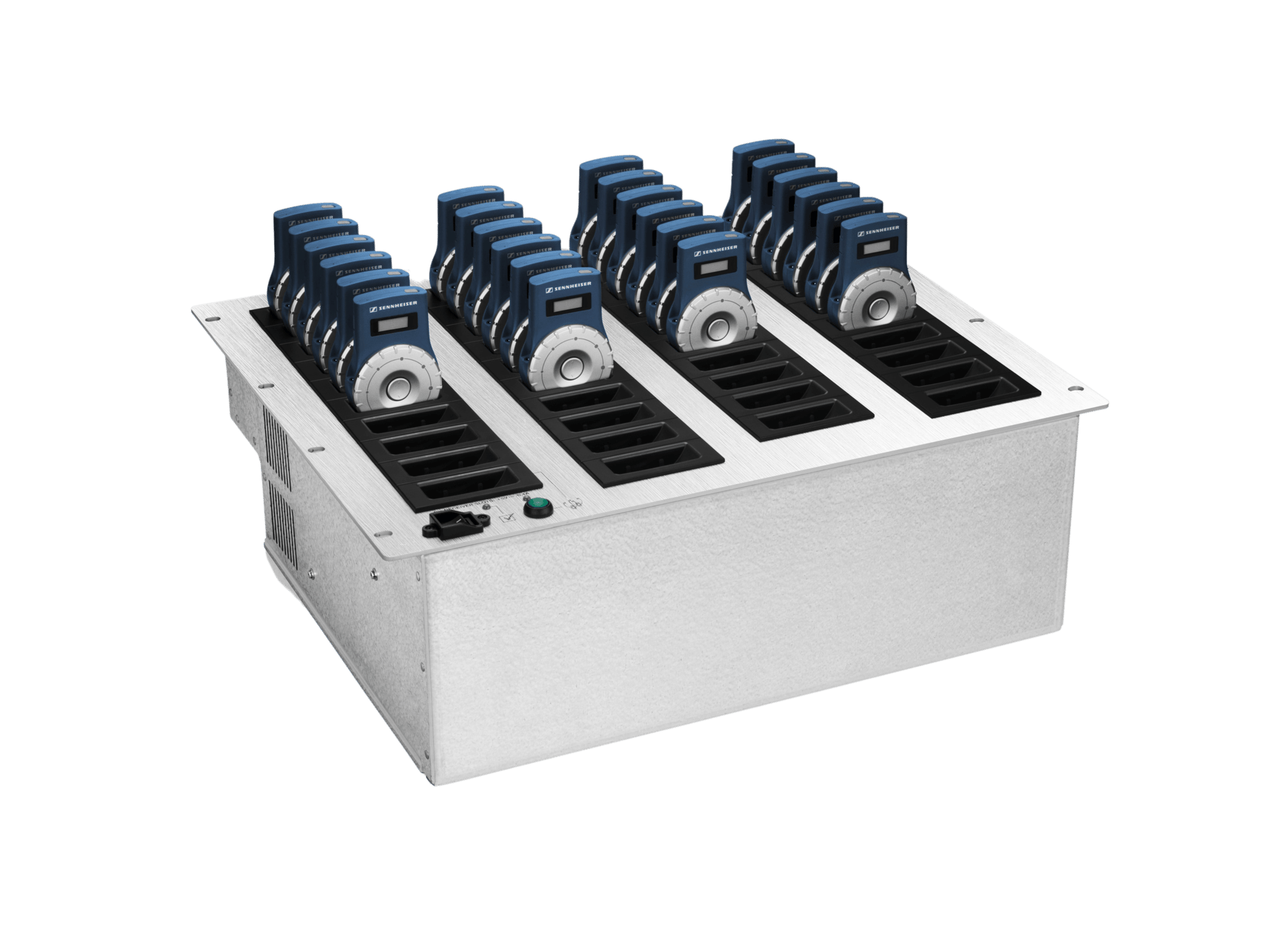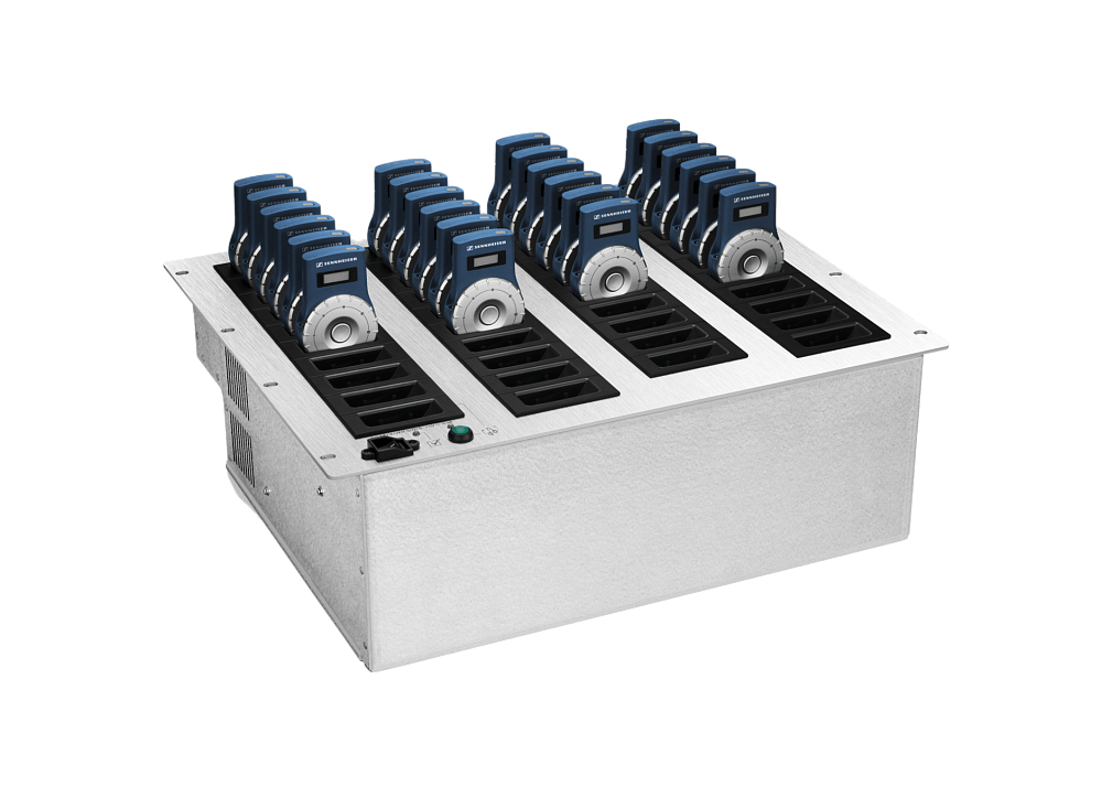 Sennheiser L 2021-40 - зарядное устройство Tourguide 19" для 40 приёмников, специально разработанное для стационарного применения. Он вмещает до 40 приемников, которые будут автоматически заряжаться. По-настоящему впечатляющей особенностью зарядного кейса является кнопка «Копировать». Все, что вам нужно сделать, это настроить один приёмник на правильный канал, нажать эту кнопку всего один раз, и все остальные приёмники в кейсе сразу же настроятся на тот же канал. В то же время L 2021-40 служит портом Ethernet LAN, что позволяет предварительно выбирать активный канал для каждого приёмника на центральном ПК. С помощью специального программного приложения CC 2021 можно запрограммировать до 125 зарядных рэковых стоек с 5000 приемниками. CC 2021 предлагает простые пресеты для выбора и подтверждения каналов для всех приёмников одним щелчком мыши. Пользователи могут легко отслеживать, какие приемники на какой станции были подготовлены для того или иного языка или программы.