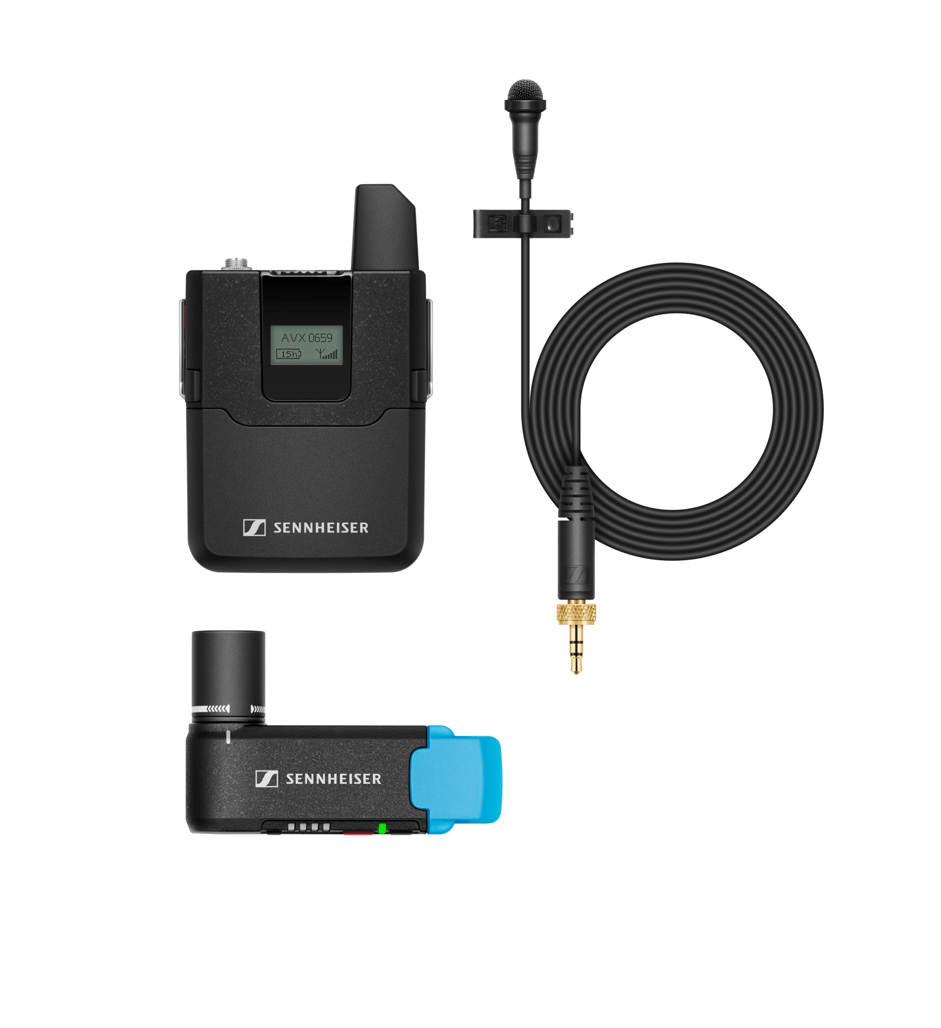 - Накамерный приёмник EKP AVX-3-EU, поясной передатчик SK AVX-3, петличный микрофон ME 2, зажим для микрофона, сетевой USB блок питания NT5-10 EU, зарядный USB кабель, адаптер-держатель для DSLR-камер, аудио кабель CL 400 (XLR x 3,5 мм).