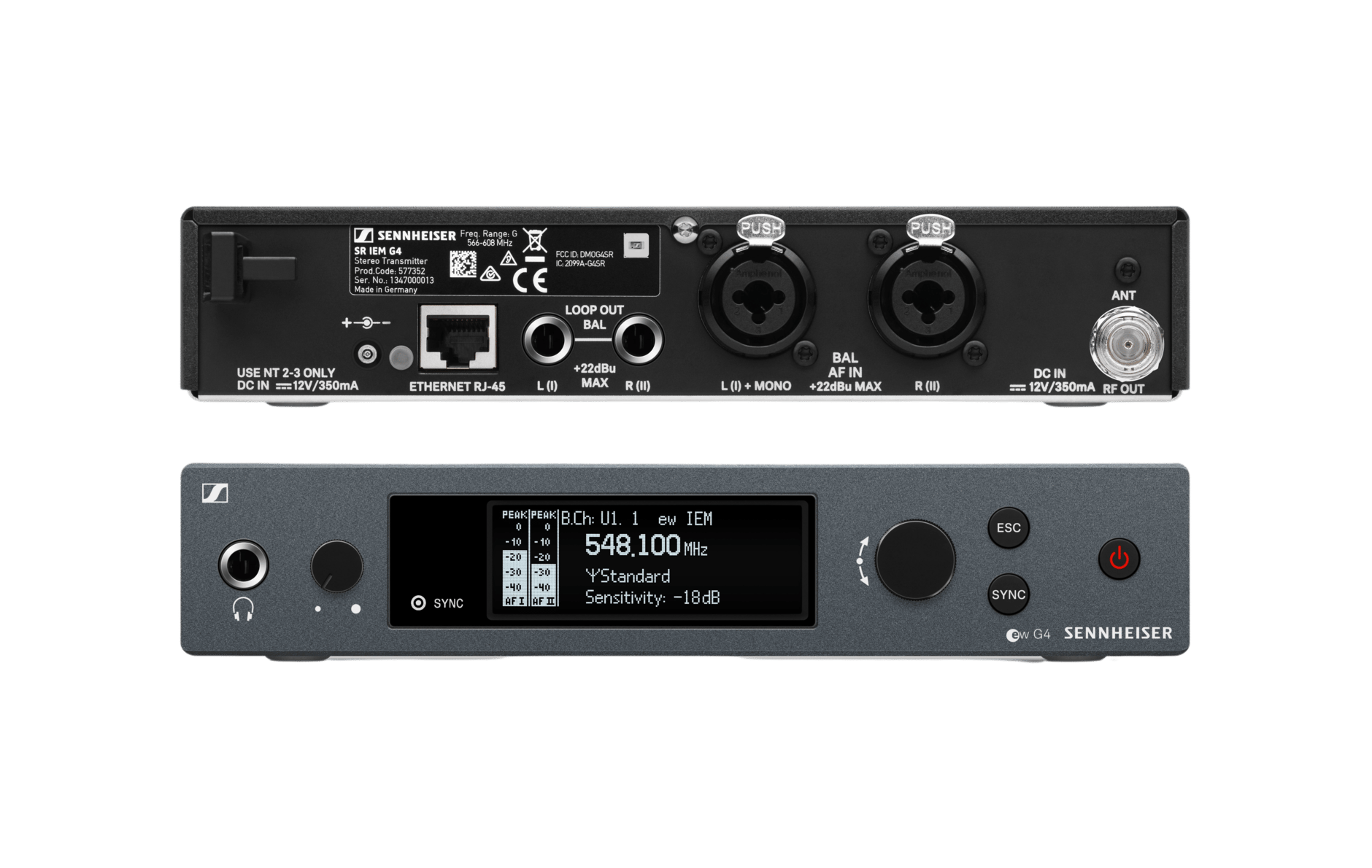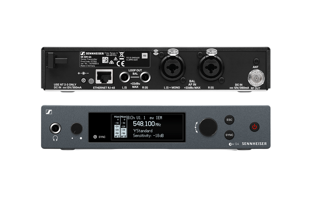 SR IEM G4 - полурэковый стереопередатчик в цельнометаллическом корпусе с органическим светодиодным дисплеем для полного управления, обеспечивающий четкость звука на всех частотах и предназначенный для ежедневного использования на сцене с мониторинговыми наушниками для мониторинговых радиосистем Evolution Wireless G4.