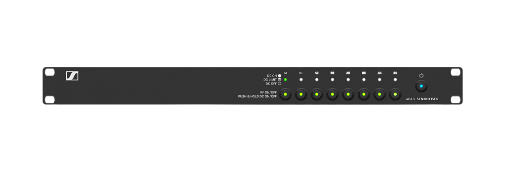 Модель оснащена включаемым DC-питанием на каждом входе, что позволяет использовать активные антенны и предусилители, включая AB 3, AB 3700, A12 AD и AB 9000. При необходимости питание можно отключить или ограничить, а фронтальная панель с LED-индикацией позволяет визуально контролировать состояние RF и DC, включая предупреждение о перегрузке или коротком замыкании кабеля. ACA 3 оснащен восьмью BNC-входами (A1–A4 и B1–B4) с DC OUT и двумя RF-выходами (A/B).