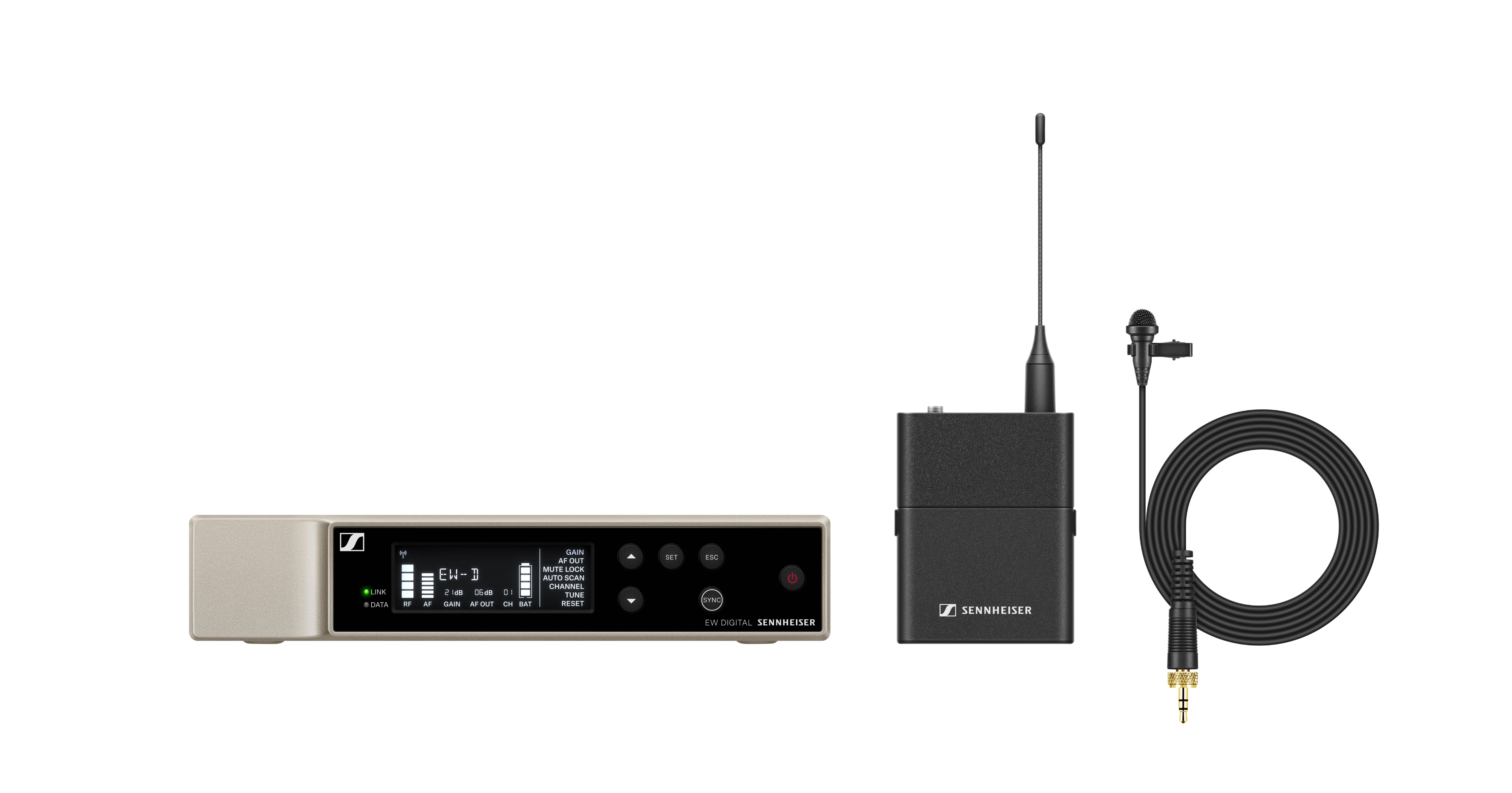 - приемник EW-D EM, поясной передатчик EW-D SK, петличный микрофон ME 2, комплект для монтажа в стойку, источник питания приемника, стержневая антенна [ 2