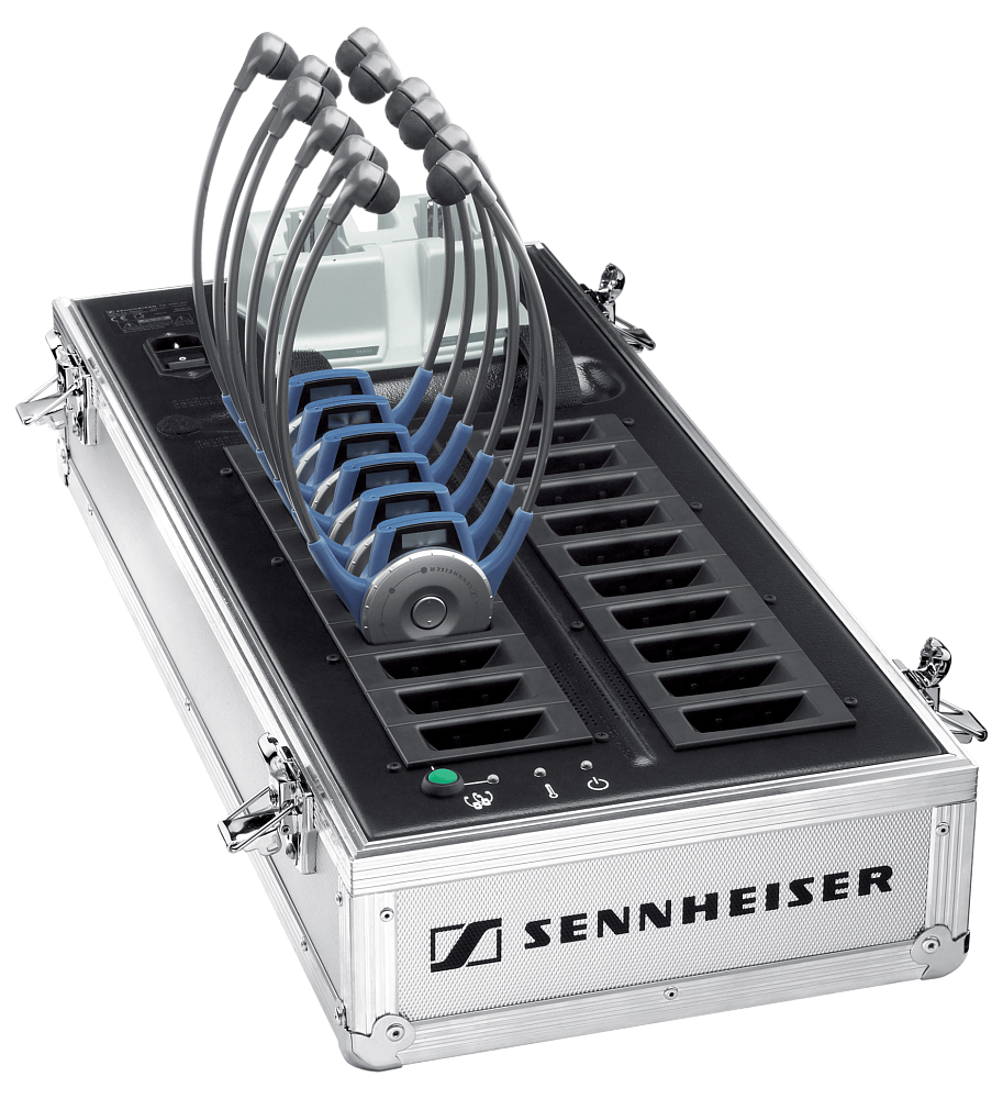 Sennheiser EZL 2020-20L - кейс для зарядки и транспортировки, разработанный для максимально удобного использования. Он является одновременно и местом хранения всего оборудования, и зарядной станцией для приемников и передатчиков экскурсионной системы Tourguide. В кейсе предусмотрено двадцать зарядных отсеков для приемников HDE 2020-D или EK 2020-D и два зарядных отсека для передатчика или его аккумуляторного блока. По-настоящему впечатляющей особенностью зарядного кейса является кнопка «Копировать». Все, что вам нужно сделать, это настроить один приёмник на правильный канал, нажать эту кнопку всего один раз, и все остальные приёмники в кейсе сразу же настроятся на тот же канал.