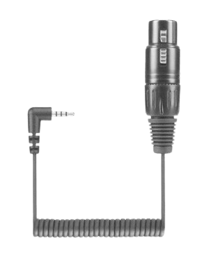 Кабель оснащен прочным XLR-3 locking разъемом на стороне радиоприемника и четырехконтактным TRRS mini-jack 3,5 мм под углом 90°, совместимым с устройствами Apple. Спиральная конструкция обеспечивает компактность и удобство в работе: номинальная длина кабеля составляет около 40 см, при этом он растягивается при необходимости, не провисая и не мешая движению. Прочная изоляция и качественные материалы позволяют использовать кабель в полевых условиях, на выездных съемках и при активной работе с камерным ригом или смартфонным стабилизатором.